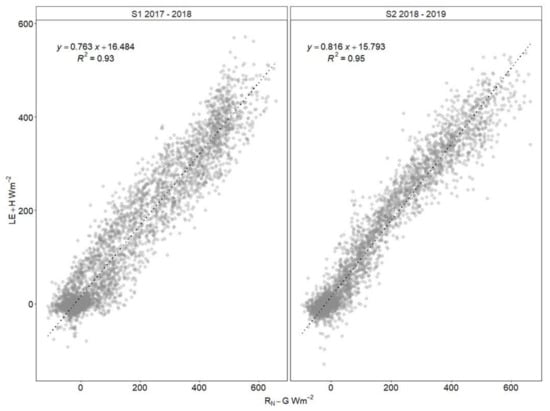 Energy balance closure analysis based on 30 min averages during seasons S1 (November 2017–March 2018) and S2 (November 2018–March 2019). The dotted line is the regression line that describes the response of LE + H to RN-G changes.