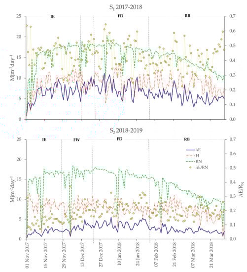 Daily average energy balance components during seasons S1 (November 2017–March 2018) and S2 (November 2018–March 2019). Dashed lines indicate the duration of the following phenological phases of the vineyard: LD = Leaf Development (BBCH-11); IE = Inflorescence Emergence (BBCH-53); FW = Flowering (BBCH-61); DF = Development of Fruits (BBCH-71); RB = Ripening of Berries (BBCH-81).