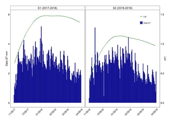 Total daily evapotranspiration of the vineyard (Daily ET) and Leaf Area Index (LAIEA) during seasons S1 (November 2017–March 2018) and S2 (November 2018–March 2019).