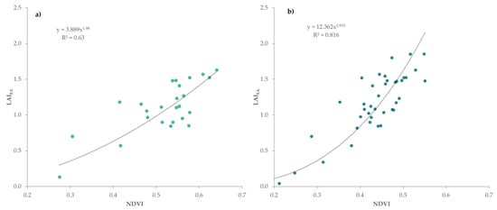 Regression analysis between the adjusted leaf area index (LAIEA) and the normalized difference vegetation index (NDVI) estimated from Landsat 7–8 (a) and Sentinel-2 (b) data. The dotted line is the regression line that describes the response of LAIEA to NDVI changes.