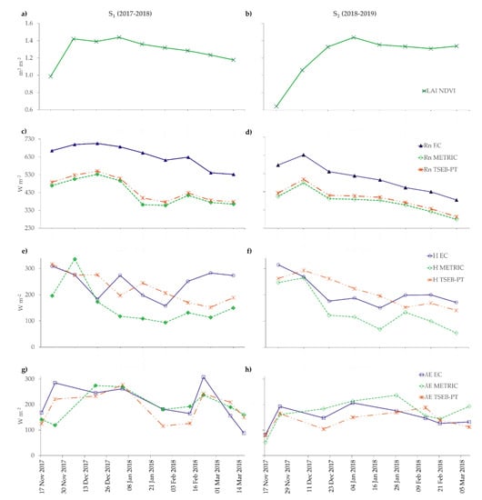 Leaf area index and energy balance components involved in the measured and modeled instantaneous latent heat flux pattern during S1 (2017–2018) and S2 (2018–2019) in Landsat 7 and Landsat 8 satellite overpass time. (a,b) Leaf area index estimated from Landsat 7–8 (LAI NDVI) data in m2/m2. (c,d) Net radiation measured by eddy covariance (Rn EC) and modeled by METRIC (Rn METRIC) and TSEB-PT (Rn TSEB-PT). (e,f) Sensible heat flux measured by eddy covariance (H EC) and modeled by METRIC (H METRIC) and TSEB-PT (H TSEB-PT). (g,h) Latent heat flux measured by eddy covariance (λE EC) and modeled by METRIC (λE METRIC) and by TSEB-PT (λE TSEB-PT).
