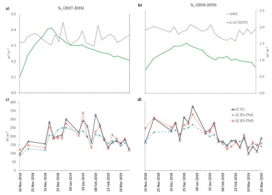 Biophysical variables involved in latent heat flux patterns (λE) during seasons S1 (2017–2018) and S2 (2018–2019) in Sentinel-2 satellite overpass time. (a,b) Soil water content (SWC) in m3 m−3 and leaf area index estimated from Sentinel-2 data (LAI NDVI) in m2 m−2. (c,d) Instantaneous latent heat flux measured by eddy covariance (λE EC), modeled by Penman-Monteith–Leuning (λE RS-PML) and Penman-Monteith–Stewart (λE RS-PMS).