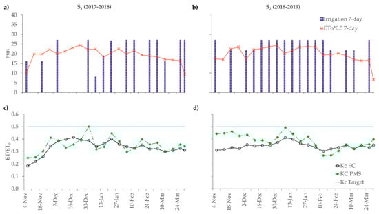 Daily average fluxes (RN, H and λE) are shown in Figure 4. RN has lower values during early and late season, around 3 MJ m−2 day−1 in November and 10 MJ m−2day−1 in March and maximum values in December and January between 17 and 18 MJ m−2day−1, corresponding to flowering and development of fruits stages. The minimum values of λE are observed in both seasons in November (1.5–2.5 MJ m−2day−1) and March (2.3–1.9 MJ m−2day−1), while maximum values are observed in January in S1 (10.2 MJ m−2day−1) and in February in S2 (9.6 MJ m−2day−1). Hence, sensible heat flux (H) in both seasons shows higher values in December and February and lower in November and March. Thus, H is consistently higher than λE, representing 48% of RN, while λE represents 42% of RN.