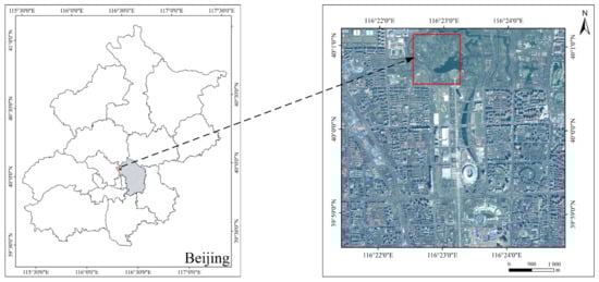 The study area (Figure 1) is located in the Olympic Forest Park (116°22′29″E–116°23′43″E, 40°0′30″–40°1′11″N), Chaoyang District, Beijing, China. The total area of the park is approximate 100 ha and the vegetation coverage rate is 95.6% [31,32]. The forests inside were manually planted and arranged in rows, clusters, and groups with a large number of single tree species. The study area was suitable for constructing a standard sample dataset due to the similarity of trees within specific zones, including tree height, size, and species. Shrubs were planted on the periphery of the arbor forest to act as a natural fence to separate roads from trees. Artificial buildings are sparsely distributed in the forest, and occupy a small portion of the area and have little impact on the forest.
