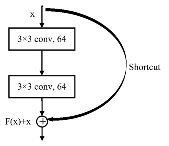 ResNet [42] was proposed to solve the problem of gradient disappearance after increasing the network depth and won first place at the 2015 ILSVRC. This model divides the output of the neurons into H(x) and F(x) in a certain layer and establishes a shortcut between convolution layers to form a residual unit (Figure 6). H(x) is the expected output after the input x passes through the convolution layers. The residual F(x) is the difference between the expected output H(x) and the input x, so F(x) = H(x) − x. The shortcut passes the input information to the subsequent layer to protect the integrity of the information and converts the learning object into residuals. The network only needs to learn the residuals F(x) rather than the complete output, and does not increase the network parameters or the computational complexity, but can greatly reduce the difficulty of network optimization and simplify the learning objectives. ResNet maintains training accuracy when the network depth is increased. Because our training image size was generally smaller than 20 × 20 pixels, the feature map would shrink after pooling. ResNet has only two pooling layers but has a deep network structure, making it suitable as a feature extractor for small images. The structures of the 18-, 34-, and 50-layer ResNet models are shown in Table 7. We changed the parameters of conv1 to make the network suitable for small sample training, and the other structures are consistent with those in He [42].
