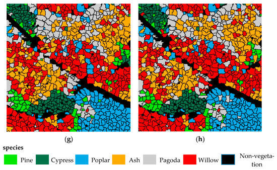 (a) The test image. Individual tree species map obtained by (b) RF, (c) SVM, (d) AlexNet, (e) GoogLeNet, (f) ResNet-18, (g) ResNet-34, and (h) ResNet-50.