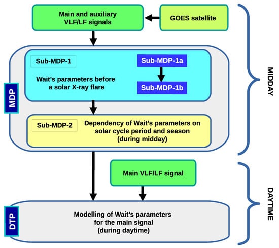 Diagram of the proposed methodology. It consists of two procedures, Midday procedure (MDP) and Daytime procedure (DTP), which are used for the midday and daytime periods. The VLF/LF signals and GOES data are given in input to MDP, which is split in two sub-procedures Sub-MDP-1, to estimate Wait’s parameters before a solar X-ray flare, and Sub-MDP-2 to model the dependency of these parameters on the solar cycle period and season at midday. To a finer detail, Sub-MDP-1 is further split in Sub-MDP-1a and Sub-MDP-1b, corresponding to the analyses of a signal s and a disturbed state i of an X-ray flare XF, and determination of Wait’s parameters in quiet conditions before a solar X-ray flare XF, respectively. DTP requires as input both the output of MDP and VLF/LF signals to model the daytime evolution of Wait’s parameters.