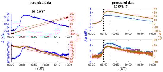 - Determination of differences in the amplitude and phase of the signal during a disturbance induced by a solar X-ray flare XF in state with respect to quiet conditions. To avoid any dependence of results on the selection of time, we perform twice the analysis of changes in the signal parameters with respect to the initial, unperturbed state, by selecting two different times which are emphasized by vertical dashed and dotted lines in right panels in Figure 2 displaying time evolutions of the amplitude () and phase () changes for both signals during the disturbance induced by the solar X-ray flare occurred on 17 September 2015.The absolute errors d and absolute errors d of amplitudes and , and d and d of phases and , respectively, are determined as for the quiet state, i.e.: (1) we calculate , , and as median values in two bins of width s around times and ; (2) we define absolute errors d and d, and d and d in terms of maximal absolute deviations of the corresponding quantities within the bins. The total absolute errors are obtained as follows:where .
