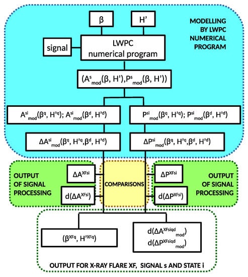Figure 3. Diagram of sub-procedure MDP-1a.According to the results presented in literature (see References [26,27,31,33,34,35]), Wait’s parameters can be considered within intervals 0.2 km–0.6 km for , and 55 km–76 km for , where the quiet conditions can be described within intervals 0.2 km–0.45 km for , and 68 km–76 km for . To model the parameter values representing a disturbed state d, and , given those describing a quiet state q, we use conditions and which are based on many studies [26,27,31]. In the following, we use these intervals with steps of 0.01 km and 0.1 km, respectively, as input in the LWPC numerical program.The first output of the Sub-MDP-1a are the pairs of Wait’s parameters referring to the quiet state before a solar X-ray flare XF for which the LWPC model can calculate the amplitude and phase differences for both main (m) and auxiliary (a) signals () and for both disturbed state () that satisfy the conditions:where and are the absolute errors in the recorded signal characteristics.The second output of Sub-MDP-1a are errors in modeling, e.g., the absolute deviations of the modeled changes in the amplitude and phase from their recorded values: and . Both outputs are used in Sub-MDP-1b. - Sub-MDP-1b. The goal of this sub-procedure is to find the pair of Wait’s parameters ,, from those extracted in Sub-MDP-1a, which provides the best agreement between the modeled and measured amplitude and phase changes of the VLF/LF signals. To do that, we analyze both the observation and modeling absolute errors, i.e., and , for observations and and for modeling. These values are used to quantify the observed and modeled weights for each extracted pair of Wait’s parameters. Details about the estimations of these weights are provided in Appendix A, while an example of representation of the extracted pairs in the 2D Wait’s parameter space is shown in the left panel of Figure 4. Each pair of Wait’s parameters is represented as a point. The color of points describes their observation and modeling precisions. To find points (i.e., pairs of Wait’s parameters) which best model the amplitude and phase changes, the region around each candidate point is analyzed as follows. The weight of each point, describing the overall observation and modeling precisions, is computed as the product of observed and modeled weights, i.e., .