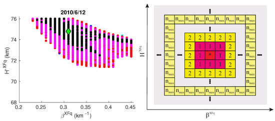 Figure 4. Left panel: Visualization of pairs of Wait’s parameters “sharpness” and signal reflection height in quiet state q that satisfy conditions given by Equations (6) and (7) for an X-ray flare XF occurred on 12 June 2010. The color of each point denotes the category of the corresponding pair. Each category includes pairs having all the four relative errors lower than c·10% (see Equation (A1)). Colors black, magenta, red, blue and cyan indicate the c-values increasing from 1 to 5 in steps of 1. The green diamond indicates the pair which provides the best agreement of modeled and recorded amplitude and phase changes for the considered X-ray flare. Right panel: Region of Wait’s parameter space around the point "*" with the visualization of the neighbor system. The first neighbors () are colored pink, the second ones () orange, and the most distant neighbors considered in the procedure () are colored yellow.Furthermore, the weight is introduced to quantify the influence of each point within the region around the candidate point. This weight is defined aswhere is the distance between the quiet states q and k which refer to pairs and , respectively.The total weight for the pair is computed as:Finally, the pair of Wait’s parameters describing the quiet D-region before a solar X-ray flare XF, which provides the best agreement of the considered modeled and observed amplitude and phase changes, is obtained as the pair with the largest total weight . The estimation errors and of these parameters are obtained from distribution of pairs which satisfy conditions (6) and (7). For instance, the error for are computed as follows. For the pair represented by green diamonds in Figure 4, the interval is estimated by taking the smaller and larger values of estimates, for the given . In the same way, we estimate the error for .