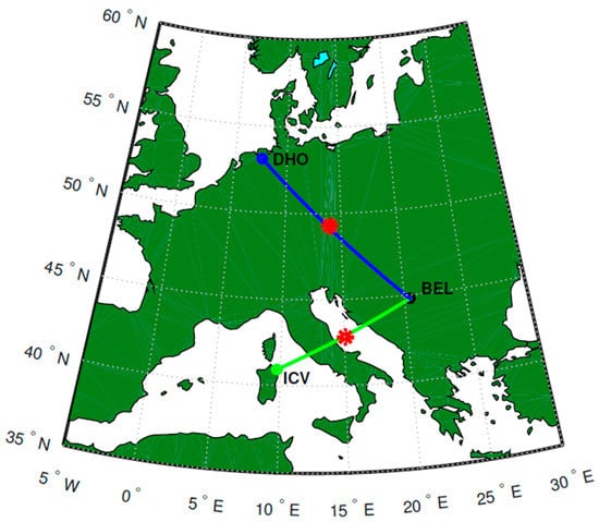 Propagation paths of the main and auxiliary VLF signals emitted by the DHO (Germany) and ICV (Italy) transmitters, respectively, and received in Belgrade (BEL). The stars indicate the locations of the path midpoints.
