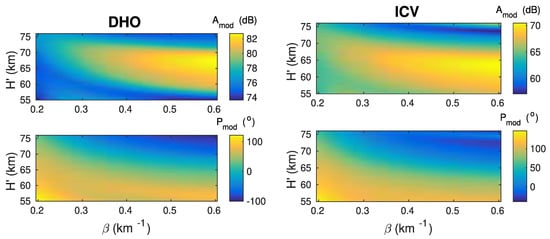 Results of modeling by the LWPC program for location of the Belgrade receiver and the DHO and ICV transmitters are shown in Figure 6. Here, it is important to pay attention to the fact that these panels represent the modeled amplitudes and phases (within the domain from −180 to 180), while the procedure for comparison of recorded and modeled signal characteristics, described in Section 2.1.2, requires changes of these values in the disturbed with respect to quiet conditions. The dependencies of these changes on the input Wait’s parameters have the same distributions as the presented corresponding graphs because they have lower than those modeled by the LWPC program for a constant value of modeled amplitude or phase in quiet conditions.