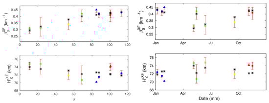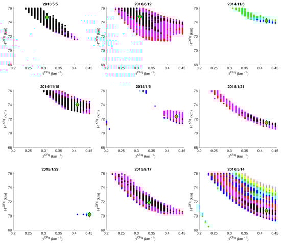 Visualization of pairs of Wait’s parameters “sharpness” and signal reflection height in quiet state q that satisfy conditions given by Equations (6) and (7) for an X-ray flare XF that occurred on the date indicated on the corresponding panel (see Table 1). Categories , describing relative errors defined by Equation (A1), are shown with different scatters: black, magenta, red, blue, cyan, green and yellow filled circles, x, +, and ·, respectively. The pair which has the largest total weight calculated by Equation (9) for a particular event, i.e., value for a X-ray flare XF, is indicated by green diamonds.