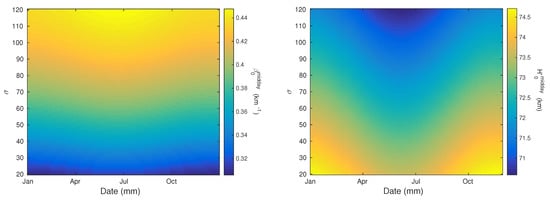 Dependencies of the midday Wait’s parameters on the solar sunspot number are shown in the left panels of Figure 8. Here, we consider the smoothed sunspot number (over 21 days) and take the value for the period of 20 days before and the considered day from the database given at http://sidc.oma.be/silso/datafiles. The upper panel indicates the increase of the parameter with , while decrease of the signal reflection height with is clearly shown in the bottom panel. These tendencies are in agreement with previous studies of Wait’s parameters during solar X-ray flares where the increase/decrease of the “sharpness”/signal reflection height with the electron density is reported (see, for example, Reference [31]). In this case, the rise of the D-region electron density is a consequence of the Ly radiation increase in approaching the solar cycle maximum. In fitting of these dependencies, we assume polynomial functions of the orders 2 and 1, respectively, which is by one order of magnitude larger than in Reference [38] where the dependency of the parameter is given as a linear function of the sunspot number, while variation of with the sunspot number is not suggested. As one can see in the right panels in Figure 8, the seasonal variation is more complex than in the previous case. However, if two scatters related to the solar cycle minimum are excluded we can see approximative sinusoidal shapes in both cases. For this reason, we assume sinusoidal dependencies of Wait’s parameters on parameter similarly as in Reference [38] but with daily (instead of monthly) changes and additional phase shifts which provide maximum/minimum values of /H’ for the summer solstice when the expected radiation coming in the considered area reaches its annual maximum.