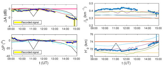 As one can see in Figure 6, there is no unique pair of Wait’s parameters that produce specific LWPC output values. That is why only one presented panel, even though the modeled amplitude/phase in quiet conditions are given, it cannot be used for determination of the input pair that provides the best fit of the observed data. The fact that it is impossible to determine a unique combination of Wait’s parameters from a single value of signal characteristic was noticed by other authors (see, e.g., Reference [36]).