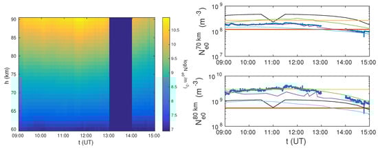 Left panel: Daytime variation of log(/1 m) during 6 September 2014 obtained by the Quiet Ionospheric D-Region (QIonDR) model. The gap between 13 UT and 14 UT is due to the one hour break in data receiving by the Atmospheric Weather Electromagnetic System for Observation Modeling and Education (AWESOME) receiver. Right panels: Comparisons of the obtained electron density time evolutions at 70 km (upper panel) and 80 km (bottom panel) with those obtained for Wait’s parameters presented in Figure 11.