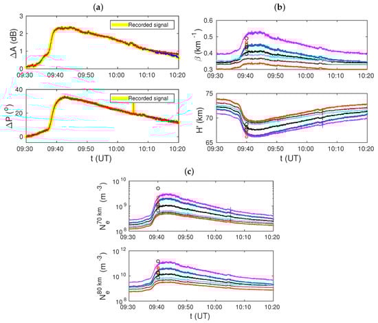 where and are given in m and km, respectively, and and altitude h are given in km. This equation was used to determine the temporal () and energy () distributions of the D-region electron density perturbed by a solar X-ray flare (see, for example, References [31,47,48]).