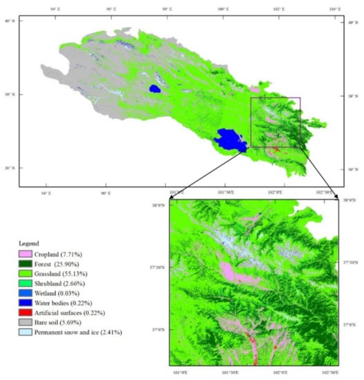 - Bo, Z.; Kunsheng, J.U.E.; Aixia, Y. Land cover dataset with 30m spatial resolution over Qilian Mountain area (1985–2017) V1.0. Natl. Tibet. Plateau Data Cent. 2019. [Google Scholar] [CrossRef]