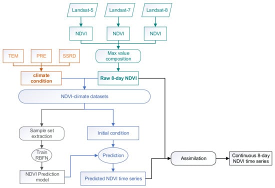 The objective of this study was to generate long-term continuous NDVI time series with available Landsat images. As shown in Figure 2, the method is composed of 4 parts: (1) the composition of raw NDVI time series and corresponding climate variables, (2) the construction of a prediction model for NDVI time series, (3) the prediction of NDVI time series, and (4) the adjustment of the predicted data to fit the observed NDVI values.