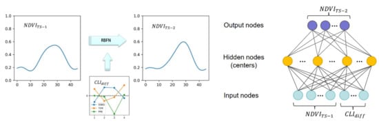 An RBFN is used here to construct the relationship between the interannual change in the NDVI time series and climate variability. RBFNs, first proposed in 1988, are a kind of artificial neural network that uses radial basis functions as activation functions []; RBFNs have been considered the best network for function mapping and have been successfully applied in function approximations, time series predictions, and classification tasks []. As shown in Figure 3, we used the NDVI time series in year TS-1 and the difference in climate variables between two adjacent years to predict the NDVI time series in year TS-2. We assumed that the difference in climate variables (climate variability) drives the interannual changes of NDVI time series. Each climate variable was aggregated to a seasonal resolution (i.e., 4 values in a year) to indicate the climate variability of corresponding pixels (discussions on the temporal resolutions of the climate variables can be found in Section 5.1). Compared with NDVI data, climate data are much coarser in terms of spatial resolution, which means that several pixels share identical climate variability. In this case, the difference of the pixels is reflected on the difference in its NDVI time series. As many studies suggest, there exists a time lag (up to months) of the NDVI’s responses to climate variables. Therefore, we perform the NDVI prediction by RBFN on a yearly basis. The time-lag effects are expected to be learned by the RBFN model inherently. The RBFN model predicts NDVI time series for a given pixel in a target year, and these predictions are used as background NDVI time series for the following procedures. The prediction accuracy determines the precision of the gap-filling method.