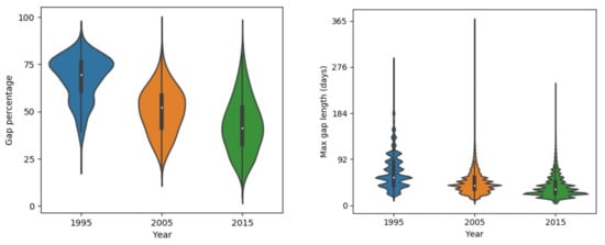 We note that the gaps were more pronounced in older years due to the sparse observations obtained in these years. Traditional methods face challenges when reconstructing time series with large gaps. The key factor in the proposed method is the extraction of the information provided by pixels with sufficient high-quality observations and the reconstruction of those pixels with large gaps in the time series.