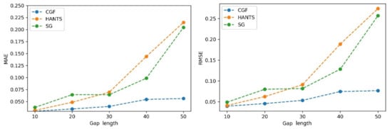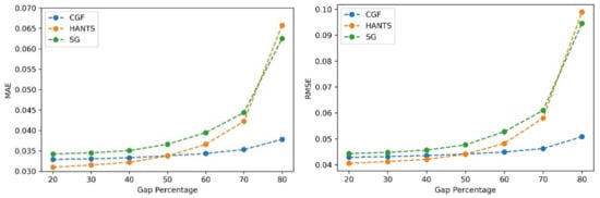 The performances of the different methods (HANTS, SG filter, and CGF) were evaluated using the NDVI time series with different gap percentages and different continuous gap lengths added. First, gaps with different percentages were randomly added to the NDVI time series. Then, the three methods were applied to generate the reconstructed NDVI time series. The MAE and RMSE values were calculated with the reconstructed values and reference values in gaps. As Figure 7 shows, the three methods showed similar performances (MAE of approximately 0.035 and RMSE of approximately 0.042) when the gap fraction was below 50%. The HANTS method performed slightly better than the other methods when the gap percentage was small (<40%). As the gap fraction increased, the accuracy of the HANTS and SG filter methods displayed an obvious declining trend. When the gap fraction reached 80%, the traditional methods induced considerable biases while the CGF method still worked with satisfying accuracy (MAE below 0.04 and RMSE below 0.08). Then, continuous gaps were added, starting from the growing season, with different lengths (10% to 50% of the whole time series). As shown in Figure 8, the methods performed similarly when the gap length was small (10%). As the gap length increased, the biases of the HANTS and SG filter methods increased rapidly. Large uncertainties in the reconstructed time series were introduced with traditional methods when continuous gaps (over 30%) existed during the growing season. The only stable method was the proposed CGF method, which had a largest MAE of 0.05 and RMSE of 0.075 when the gap lengths reached 50% of the total time series. Thus, the CGF method is suitable for the reconstruction of Landsat NDVI, which is usually contaminated with obvious gaps (as shown in Figure 5).