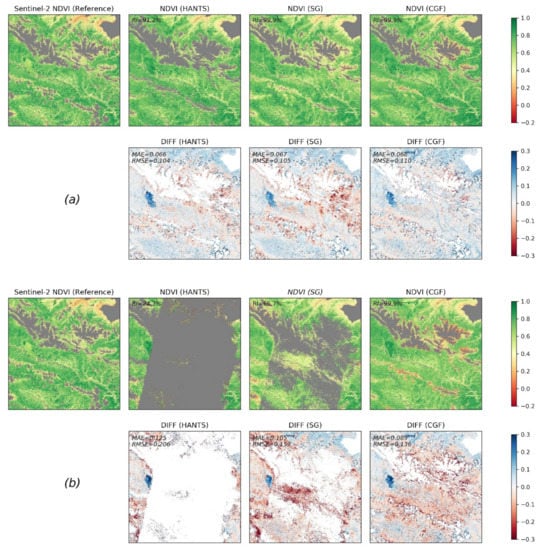 - Julien, Y.; Sobrino, J.A. Comparison of cloud-reconstruction methods for time series of composite NDVI data. Remote Sens. Environ. 2010, 114, 618–625. [Google Scholar] [CrossRef]