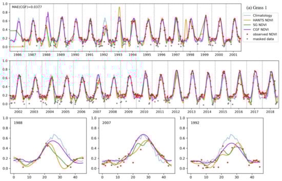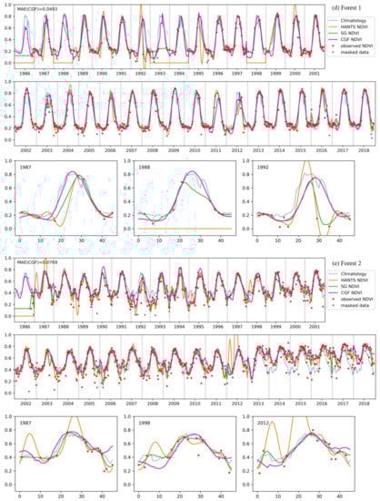 Figure 10 shows a comparison of the reconstruction methods for long NDVI time series of different vegetation types. The traditional reconstruction methods (HANTS and SG filter) performed well, as expected, when the observed data were sufficient (usually in the years after 2000). However, when the observed data were sparse in the time series, the traditional methods usually failed or yielded unreasonable results. The HANTS method failed when there were fewer than 7 observed data in a year and induced large errors when the observed data were sparse, e.g., in 1992 for forest-1 and in 1987 for forest-2. When key points were missing, the SG filter method introduced unrealistic phenology trajectories due to its linear interpolation procedure (e.g., in 1993, as shown in Figure 10c). The HANTS and SG filter methods are sensitive to undetected outliers when the available observation data are sparse, e.g., in 1992 and 2007 for grass-1. Gaps in the key growth periods lead to the traditional methods yielding false NDVI trajectories. A gap in the peak region induced the loss of reconstructed growing seasons in the reconstruction results of 1991, 1993, and 1995 for grass-1. The gaps in the growing period in 1987 for forest-1 and during the senescence period in 1988 for grass-1 led to unreasonable HANTS and SG results. Thus, the traditional methods cannot correctly reconstruct the NDVI time series when large gaps exist in the NDVI time series. The climatology method can produce NDVI time series given large gaps. However, the results neglected annual changes in vegetation growth, which is not in accordance with the actual situation (e.g., the year after 2013 for forest-2). The climatology method could yield unreasonable results when the vegetation type changes over the years (for example, if grasslands transferred to bare soils or croplands). Comparably, the performance of the CGF method was more stable under different circumstances. With the incorporation of climate variables, the CGF method exploits the relationship between NDVI and climate variables that is generated from the data itself. The reconstruction MAE is generally approximate 0.05 (except for that of the evergreen forest), which demonstrates the effectiveness and accuracy of the proposed CGF method in the reconstruction of long-term Landsat NDVI time series.