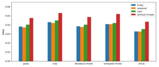 The vegetation growth in a specific region is constrained by its climatic conditions. In this study, the difference in climate variables between adjacent years is used as a conditional parameter that helps to find similar patterns more accurately for the target pixel. The role of climate data and the structure (compositing period) of the climate variables in the RBFN prediction model are studied for different vegetation types. Five thousand samples of each vegetation type were extracted from the sample set generated in Section 3.2.2. Then, the RMSE was calculated for the prediction results from the RBFN models using different climate data structures (i.e., without climate, 8-day, seasonal, and yearly). As Figure 11 shows, similar results were exhibited for all these vegetation types. The RBFN model predictions conducted without climate data, which resulted in higher RMSEs for all vegetation types, significantly decreased the prediction accuracy. Comparatively, the models in which the seasonal climate variables were incorporated achieved the best performance in different vegetation types. More generalized climate data (e.g., yearly) may not be sufficient to constrain vegetation changes, while a higher temporal frequency may be sensitive to bias in climate variables. Thus, climate data improve the prediction accuracy of RBFN models, and a seasonal structure is most effective in this task.