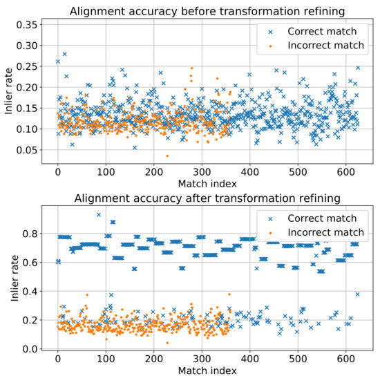 One may argue that the transformation validation should be done with the initial transformations estimated from the correspondences before the transformation refining to remove incorrect correspondences further and to reduce unnecessary tries to find the correct transformation. However, in our experiments, we find that the inlier ratios under the coarse transformations are not sufficient to distinguish the right transformations from those that are wrong. As is shown in Figure 5, before the transformation refining, the inlier ratios are low under both the transformations estimated from the correct and incorrect correspondences, and there is not an obvious threshold of inlier ratio that can distinguish the correct transformations from these wrong ones. After the transformation refining, the inlier ratios of correct transformations are much higher than those of incorrect transformations in most of the cases.