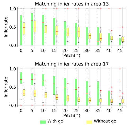 Figure 7 shows the matching inlier rates under different viewing angles in both areas. As can be seen, the inlier rate of the initial PICF correspondence set obtained with finding the nearest neighbor in the PICF descriptor space is acceptable. In both areas and under all view angles, the inlier rate of the initial correspondence set is no less than , which indicates that the proposed PICF can encode the geometric structure effectively and is discriminative. It also proves that the PICF is projective-invariant. Furthermore, the geometric coherence based matching method is efficient to improve the initial matching quality, especially when the viewing angle is relatively small. As is shown in Figure 8, the improvement mainly comes from the ability of the geometric coherence based matching method to reject most of the wrong correspondences while preserving most of the right correspondences. The good performance is more obvious when the roads are dense in the search area (17th area). In such areas, the similar local structures of the road network are ubiquitous, leading to a low inlier ratio of initial matching. It is thus more meaningful to use the geometric coherence constraint. The improvement of the matching inlier rate is significant to reduce the unnecessary tries in the following geometric consistency validation and to improve the efficiency. Even though the geometric coherence based matching method is less effective when the viewing angle is large, since it may reject all the right matching pairs for some aerial images in such a case, leading to an inlier rate of zero, we try to recover the homography transformation from the rest candidates to ensure our algorithm can work in such a case.