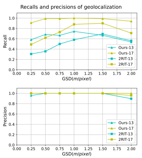 Precision and recall of geolocalization under different GSDs of the “2RIT” method [5] and our method.