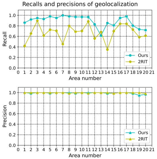 Precision and recall of geolocalization in different areas of the “2RIT” method [5] and our method.
