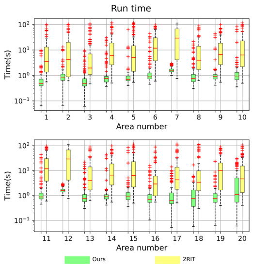 The run time of geolocalization for both methods is shown in Figure 11. In 17 out 20 areas, the average geolocalization time method proposed in this paper is less than 1 s and is less than 2 s in all 20 areas, while the average run time for “2RIT” is usually several seconds or even tens of seconds in areas like the seventh area and the 12th area. In all areas, the average run time of our new algorithm is less than that of “2RIT”. Besides, the run time of the PICF based geolocalization method varies more slightly between different aerial images in the same area compared with “2RIT”.