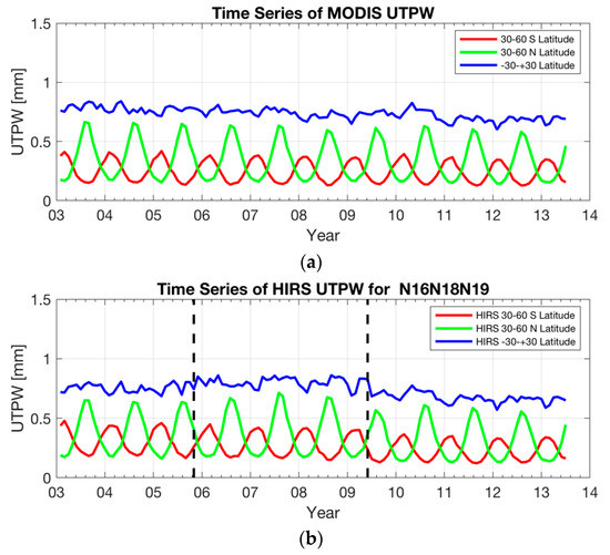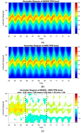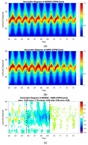 Hovmoller plot of Upper Tropospheric Precipitable Water Vapor (UTPW) in 2003–2014 for Aqua MODIS (a) and NOAA-16, -18, and -19 HIRS (b) along with the MODIS minus HIRS difference (c). Vertical dashed lines indicate the time when the operational satellite changed from NOAA-16 to NOAA-18 in November 2005 and from NOAA-18 to NOAA-19 in June 2009.