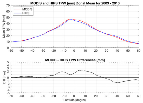 Zonal mean TPW values for MODIS and HIRS (top) and their differences (bottom) for 1 degree latitude bands.