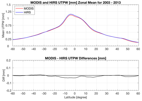 Zonal mean UTPW values for MODIS and HIRS (top) and their differences (bottom) for 1 degree latitude bands.