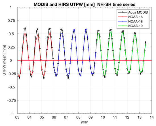 The HIRS and MODIS moisture records retrieve total column precipitable water vapor (TPW) as well as integrated high (UTPW), mid, and low layer tropospheric precipitable water vapor. This is accomplished with a statistical regression [17,18,19,20,21] developed from an atmospheric profile database [22] that consists of geographically and seasonally distributed radiosonde, ozonesonde, and ECMWF reanalysis data. TPW and UTPW are determined for clear sky radiances (and brightness temperatures, BTs) over land and ocean both day and night. The Aqua/MODIS TPW and UTPW (MYD08C3 C6.1, [23]) are 1° degree spatial resolution products with one monthly average value. The HIRS TPW and UTPW products are binned into a global map of 0.5° lat-lon boxes, for 4 time periods daily (night before and after midnight and day before and after noon), compiled into monthly amounts (for the operational months of each satellite).