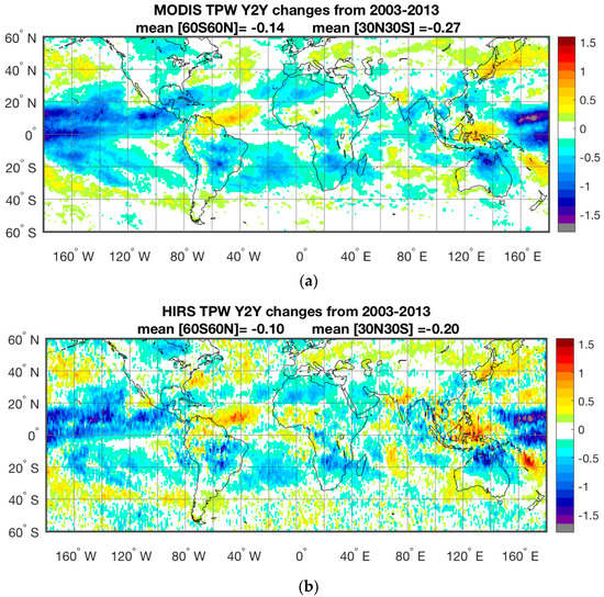(a) MODIS Aqua mean year to year change in UTPW from 2003 to 2013. The same months are used as in the HIRS data below. Spatial resolution is one degree. (b) HIRS mean year to year change TPW from 2003 to 2013. Spatial resolution is 1 degree. Data from the HIRS sensors on NOAA-16, -18, and -19 are included. Same sensor detection of UTPW differences for the same month from one year to the next are computed separately for all twelve months and then aggregated over the years 2003–2013; averages are taken over all months to infer mean changes. Overall mean for Tropics (denoted by [30N30S]) and for the 60°S and 60°N latitude band (denoted by [60S60N]) are in the subtitles.