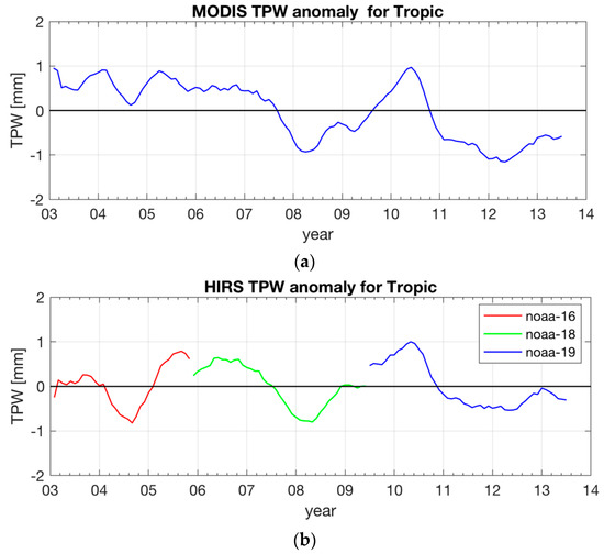 Anomaly of TPW with respect to the mean value for (a) MODIS from 2003 through 2013 and (b) each HIRS separately from 2003 to 2005 (NOAA-16), 2006 to 2008 (NOAA-18), and 2009 to 2013 (NOAA-19).