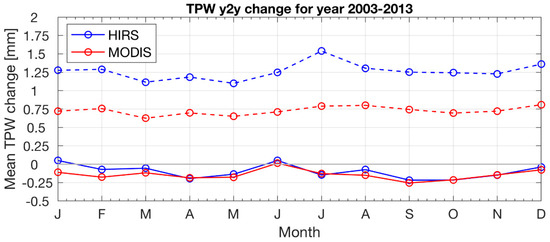 HIRS and MODIS mean (solid) and standard deviation (dashed) of year-to-year TPW changes by month from 60°S to 60°N during 2003 to 2013.