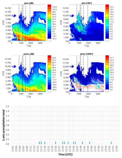 Figure 3. Time evolution of pow, pha, powx and phax (upper two rows) from 17:00 to 18:00 UTC on 2 August 2018. The x-axis shows time (T [s]), while the y-axis displays the height above the radar site (z [m]). Quantities pow and powx are in dB, whereas pha and phax are in arctan of phase degree multiplied by 100 and 1000, respectively. The dashed lines show the time of lightning discharges recorded up to 0.75 km from the radar site. The lower graph shows the 1-min precipitation totals as measured during the same period by the automated weighting rain gauge situated next to the cloud radar.