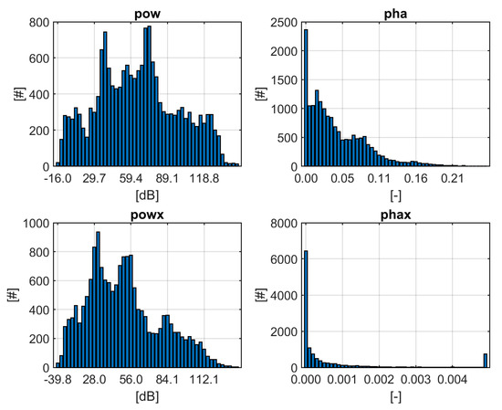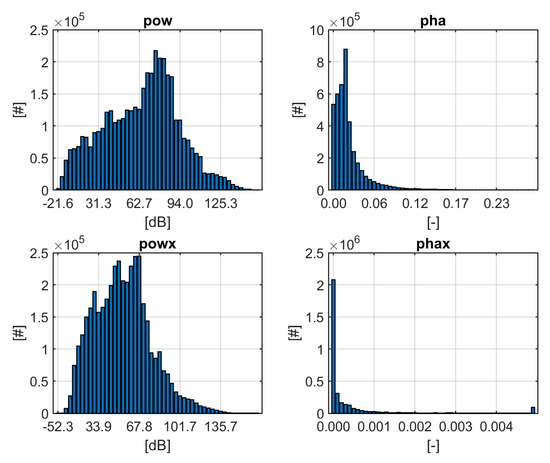 Figure 5 and Figure 6 show distributions of measured values of pow, pha, powx and phax from all the gates for “near(1 km)” and “far” data, respectively, during the analyzed days with thunderstorms (Table 2). It is clearly visible that the distributions are asymmetric for both the “near(1 km)” and the “far” data. Therefore, we used median and percentiles to describe the data distribution in further analyses.