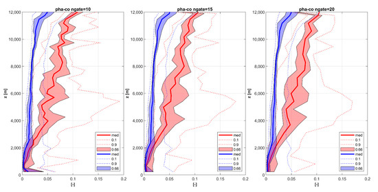 Since the results might be influenced by the thickness of considered vertical layers determined by the selected number of gates, ngate, included in a layer, we clarify this influence by comparing vertical profiles for ngate=10, 15 and 20. The impact of selected ngate on the results is illustrated in Figure 7 for pha, which depicts median values, area between 33rd and 66th percentiles and 10th and 90th percentiles (hatched curves).