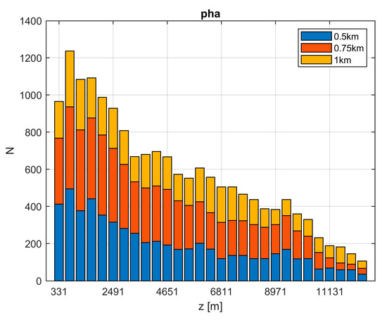 Figure 8. Measured data counts (N, y-axis) for pha in individual vertical layers containing each ngate = 15. The x-axis displays the height of layer centers (z [m]) and blue columns show the number of data in “near(0.5 km).” The number of data in “near(0.75 km)” is the sum of blue and red columns, whereas the number of data in “near(1 km)” is the sum of blue, red and yellow columns.