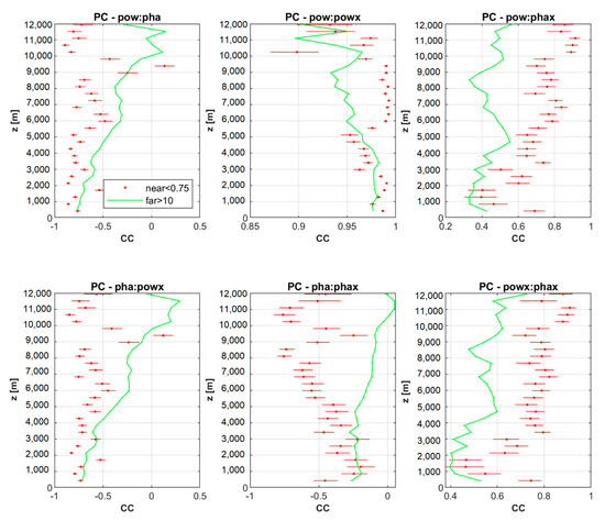 Figure 11. Correlations (CC) by Pearson (PC) between pairs of pow, pha, powx and phax in dependence on height (z [m]) above the radar site. Red points represent PC for “near(0.75 km)” data, while the green line indicates PC for “far” data. Horizontal lines shows 95% confidence intervals.