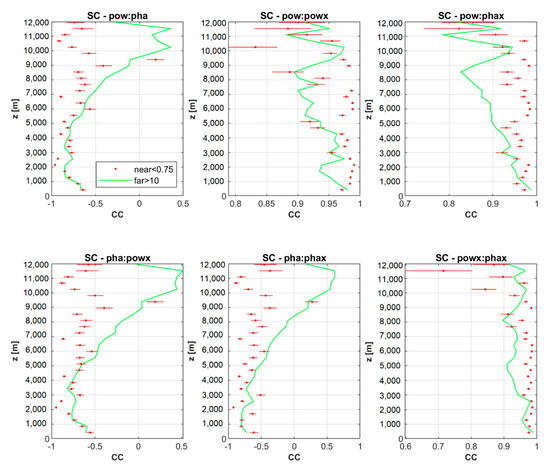 Figure 12. Correlations (CC) by Spearman (SC) between pairs of pow, pha, powx and phax in dependence on height (z [m]) above the radar site. Red points represent SC for “near(0.75 km)” data, while the green line indicates SC for “far” data. Horizontal lines shows 95% confidence intervals.