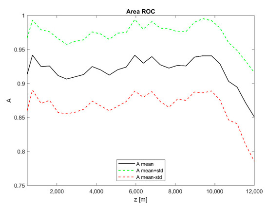 Figure 14. Calculated A, the area below ROC, in dependence on elevation above the radar site (z [m]). The figure shows mean values of A (black solid line) and mean A ± standard deviation of A (dashed lines).