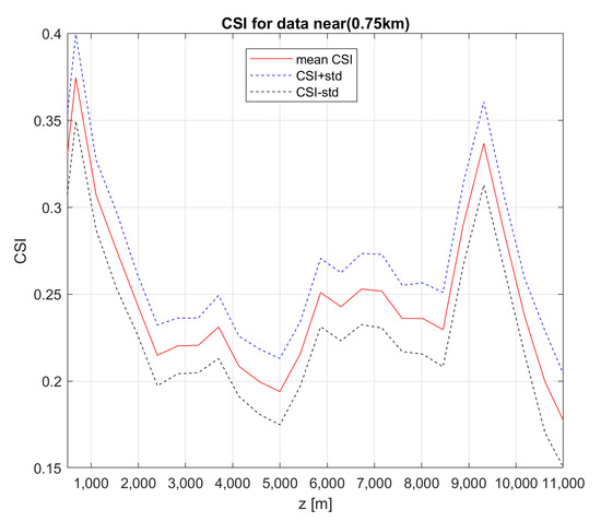 Figure 15. Calculated Critical Success Index (CSI) in dependence on elevation above the radar site (z [m]). The figure shows mean values of CSI (red solid line) and mean CSI ± standard deviation of CSI (dashed lines).