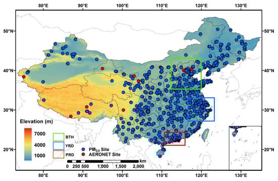 Spatial distributions of the 1583 PM2.5 (blue) and aerosol optical depth (AOD, red) surface measurement stations operating in 2018. The background is an elevation map of China, and the three main urban agglomerations are also shown.